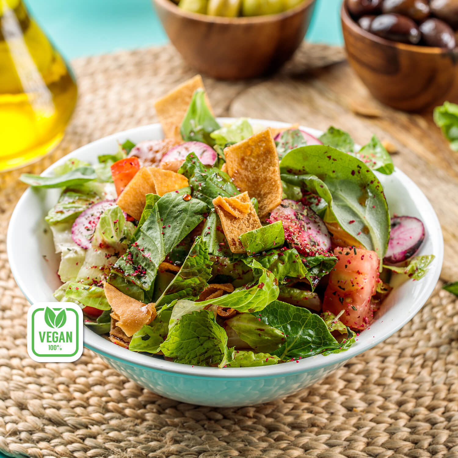 نکته: نعناع را درست قبل از سرو سالاد خرد کنید تا مانع تغییر رنگ آن بشوید. در صورتی که مایلید میزان چربی کمتری استفاده کنید، میتوانید با اسپری به روی پیتاها کمی روغن بپاشید و سپس آنها را بدون سرپوش، درون فر داغ بگذارید تا ترد شوند و سپس آنها را به قطعات کوچکتر خرد کنید و روی سالاد بریزید.